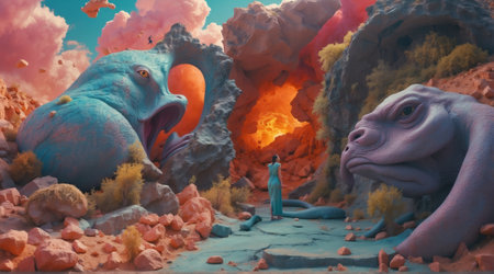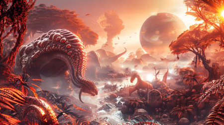 Fantasy alien planet with abstract animal creatures. 3d render illustration.