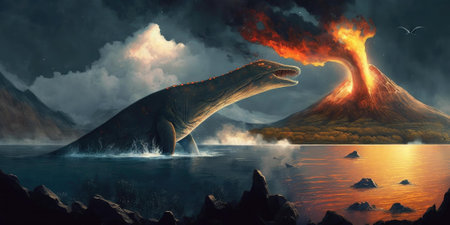 Prehistoric creature or dinosaur in the wild nature. Realistic style drawing. superlative generative AI image.