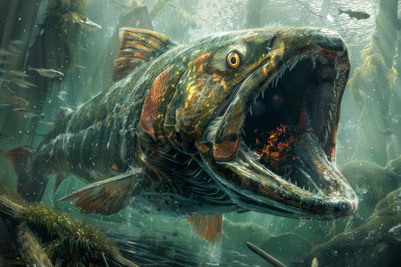 A striking image of a fierce predator fish showcasing its sharp teeth as it swims through its underwater habitat, surrounded by smaller fish. The scene captures the beauty and diversity of aquatic life.