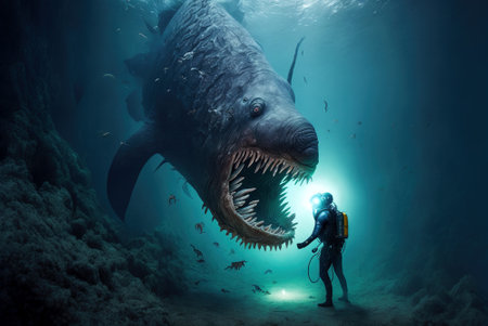Sea monster attacks diver, fantasy underwater scene, generative AI. Scary marine predator like prehistoric animal hunts on people. Concept of jaws, ocean, teeth, horror and fear. 3d illustration.