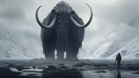 a mammoth stands in an ancient lake, its surroundings adorned with snow and rocks. this whimsical yet eerie photo captures the essence of animal symbolism in a science-fiction setting. the mammoth's strong facial expression adds to its iconic presence, while the misty appearance gives it a frostpunk vibe. this captivating image is perfect for an imax experience. ai generated