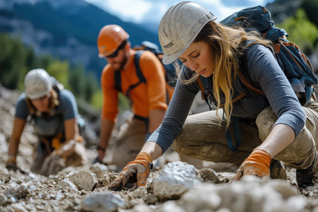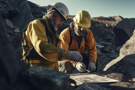 Geologists examining rock samples or using specialized equipment to analyze the geological composition of a mining site, emphasizing the scientific aspect of mining. Generative AI