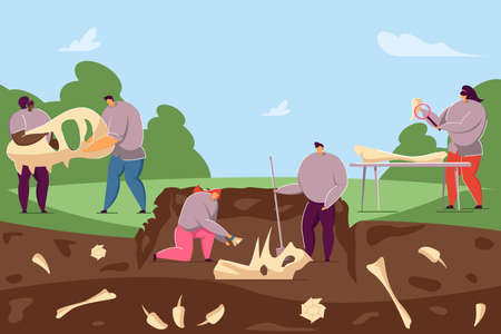 Paleontologist with fossil. Scientists working with ground excavation and prehistorical animal skeleton. People digging up dinosaur bones. Vector exploring and discovery illustration