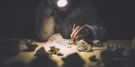 Paleontologist with headlamp at a dim excavation site, carefully brushing sediment to reveal fossil bones and artifacts, documenting a meticulous scientific discovery