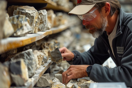 An elder male geologist with a beard meticulously inspects a rock specimen among shelves of various stones, embodying expertise and concentration. geologist