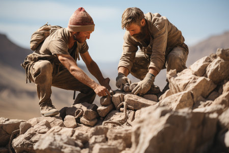 two paleontologists extract fossilized bone from the ground in the desert