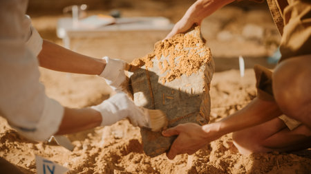 Archaeological Digging Site: Two Great Archeologists Work on Excavation Site, Carefully Cleaning, Lifting Newly Discovered Ancient Civilization Cultural Artifact, Historic Clay Tablet, Fossil Remains