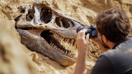 In a sandy area, a researcher closely photographs a large dinosaur skull while uncovering it from the surrounding material. Excitement fills the air during this significant find