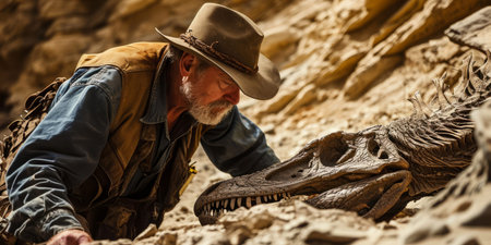 Paleontologist Examining Dinosaur Fossil. Intense study of a prehistoric skeleton by a seasoned paleontologist.