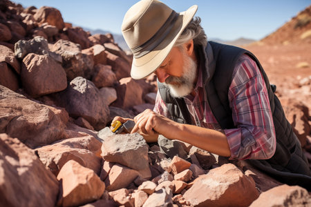 An elderly Caucasian male archaeologist is digging for artifacts at a work site.