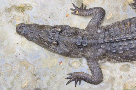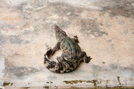Crocodile basking in the sun, on a concrete surface, top view, close-up, crocodile farm, crocodile farming.