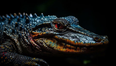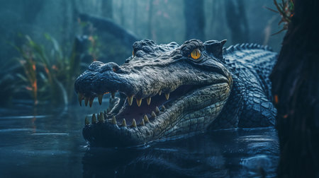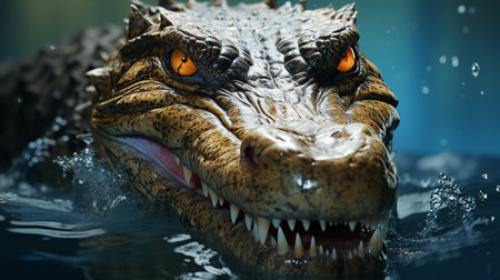 crocodile walking through the water in a hyper-detailed and realistic style. the dark blue and amber colors create a tenebrous atmosphere, while the strong facial expression of the crocodile is captured with photorealistic accuracy. shot with a sony alpha a1, this matte painting video wallpaper is a stunning depiction of nature's power. ai generated
