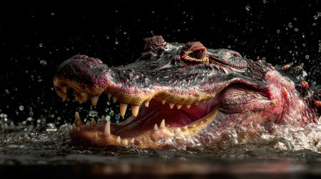 A stunning close-up of a crocodile displaying its fierce teeth and dynamic splash in water. The low-light setting highlights the reptile's textures and vibrant colors.