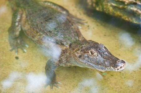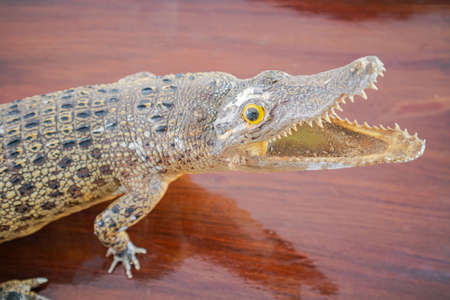Snapshoot of crocodile. Caiman yacare - small-mid sized crocodilian from alligator family. Caiman crocodilus, reptile head with open jaws