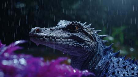 a mesmerizing 4k photo captures a felt stop-motion crocodile amidst a pakistan forest storm, with a stunning waterfall as the backdrop. the image showcases a shallow depth of field, highlighting the dark lavender forest. the use of spandex adds a unique touch, while the night setting enhances the lavender and blue tones, creating a captivating and low saturation atmosphere. ai generated