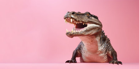 Dwarf Caiman with rough textured skin and sharp teeth lies in isolation against a white backdrop illuminated by dramatic lighting to highlight its features.