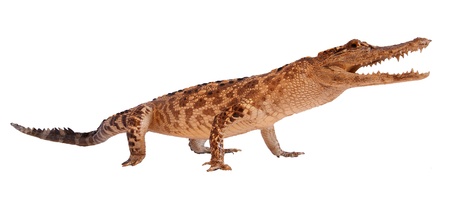 Walking Young West African slender-snouted crocodile, Mecistops cataphractus, isolated on white