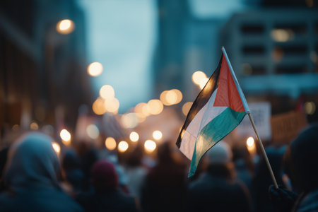 Palestine flag waving gently in the wind, peaceful protest atmosphere, soft lighting, people in the background holding candles and signs of peace, unity AI Generated