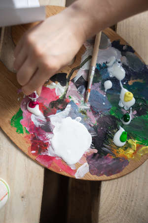Close-up of the artists hand with a wooden palette paint from a tube is squeezed out for mixing. Creative workshop for artists and art supplies.
