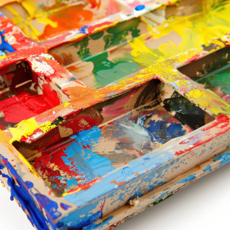 A vibrant artist's palette displaying an array of paint colors against a white textured background.