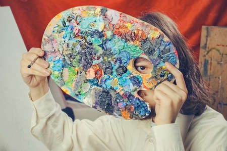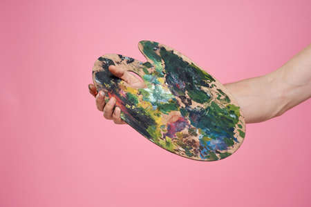 Hands of female artist holding messy dirty palette with different dry old acrylic paints in art studio. Lifestyle and hobby concept. Toned with retro vintage hipster filters.
