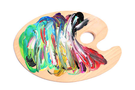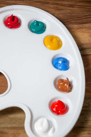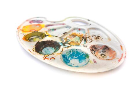 Plastic art palette with blobs of paint against colorful background. Concept Art, hobby, craft