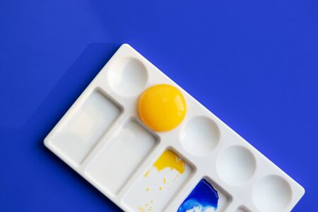 White palette with paints. Blue background. Instead of yellow, the egg yolk is used. Creative design and art. Top view and copy space