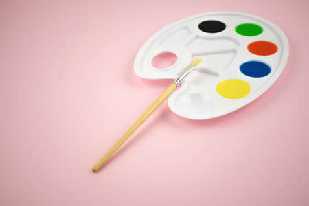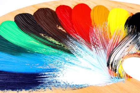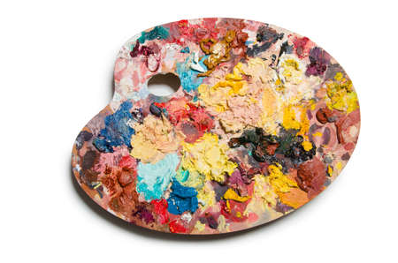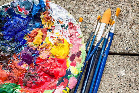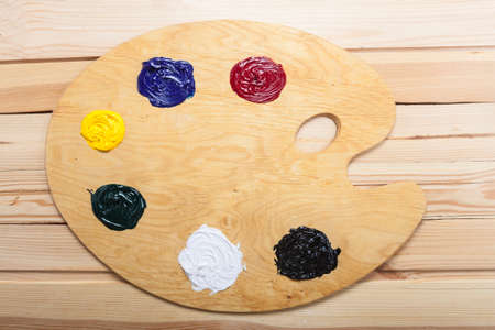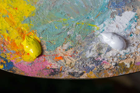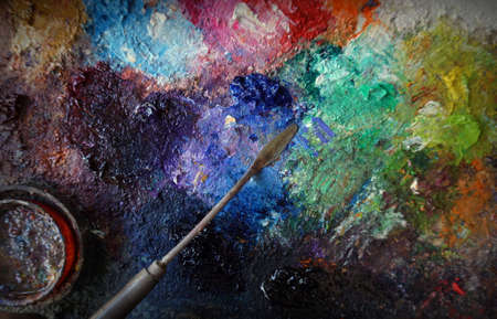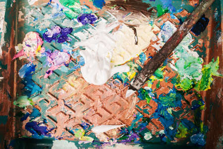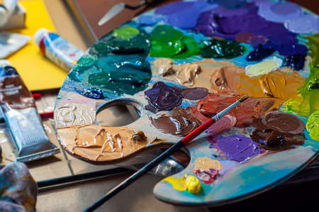 Palette with oil paints and a brush. Painting process, art workshop. Different paint colors applied for mixing