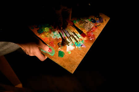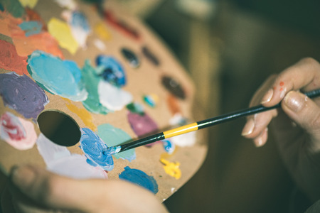 artist painting with acrylic colors and mixing tones on the pallet. blur background abstract photo - vintage effect