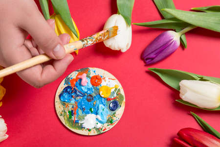 Female hand painting with brush on white tulip near tulips flowers on red background. Spring concept