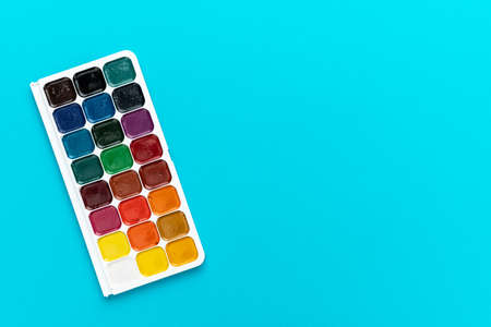 Minimalist photo of watercolor palette on turquoise blue background. Set of watercolor paint with copy space.