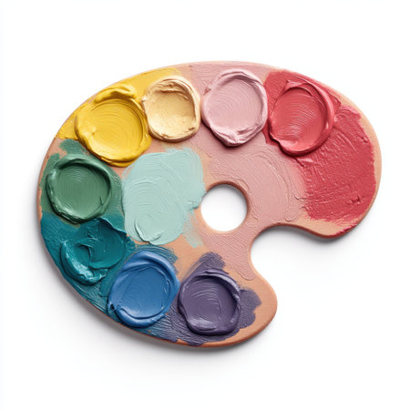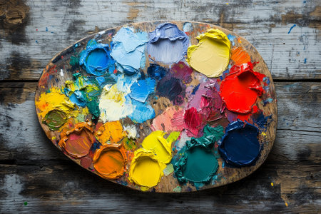 A colorful artist palette displaying a variety of vibrant paint colors, perfect for art projects. Ideal for artists seeking inspiration and creativity in their work.