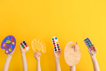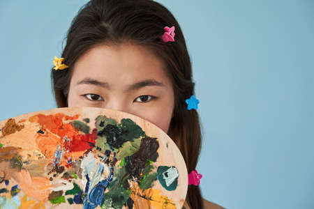 Woman wearing cute hairpins at her head hiding her face behind palette with paints