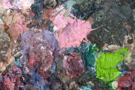 Background of an artist's palette with mixed dried acrylic paints. An abstract artwork.