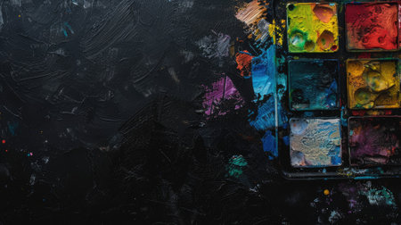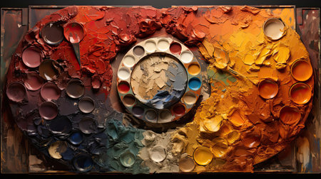 A colorful artist's palette with paints, showcasing an array of vibrant colors in a creative setting.