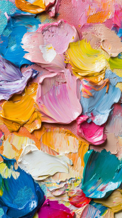 This captivating artwork features a vibrant array of colors and textures created using thick brush strokes. The lively palette showcases the artist's unique style and creativity.