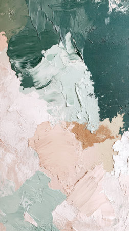 This artwork showcases a blend of forest green, creamy beige, and dusty rose, reflecting the harmony of nature. Its textured layers create an organic and soothing visual experience.