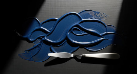 Dark blue paint strokes with visible texture applied by a palette knife, resting on a deep charcoal grey surface. artistic concept of creativity and craft.
