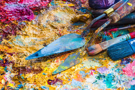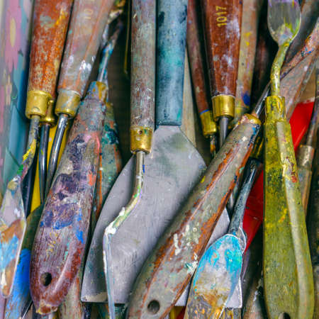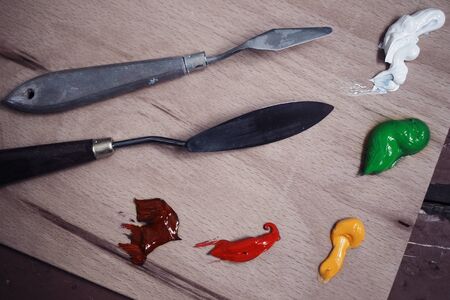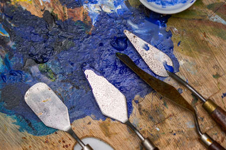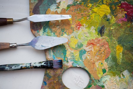 Photo Assortment of dirty artist's tools laying on studio bench splattered in oil paint