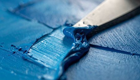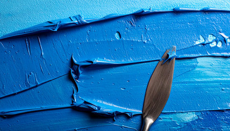 A palette knife glides through thick, vibrant blue oil paint, creating a rich impasto texture on the canvas.
