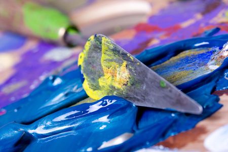 spatula on a palette with oil paints. yellow paint, extruded from the tube