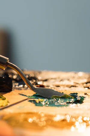 Visual art. Painting class. Creative education. Professional craft. Knife blending blue orange oil or acrylic paint colors on dirty stained palette on blur gray copy space background.
