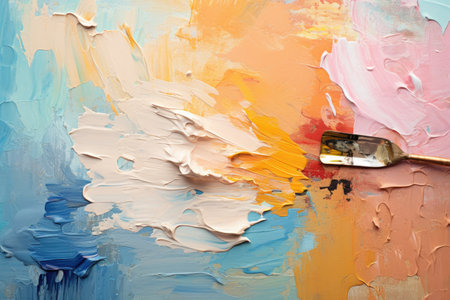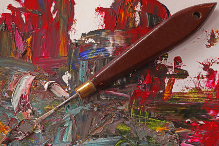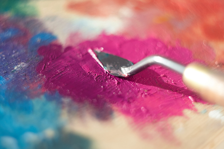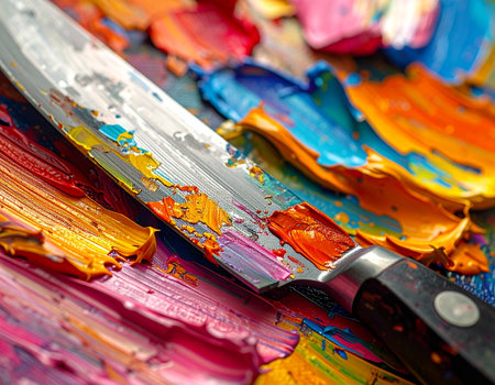 Close-up image of a palette knife smeared with vibrant oil paints, showcasing a rich array of colors ideal for artists seeking inspiration and creativity.