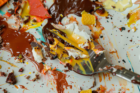 A plate of food is covered in crumbs and debris, with a few pieces of carrot scattered around. The plate is on a white surface, and the overall mood of the image is one of messiness and disarray