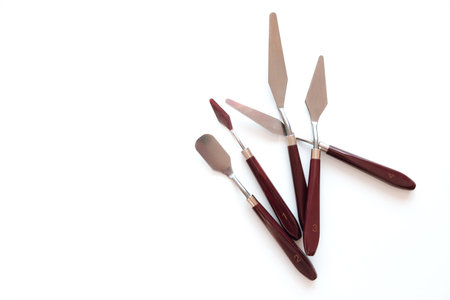 Painting palette knife used with dark brown handle be stained gold color isolated on white background - Artist tool and Object concept