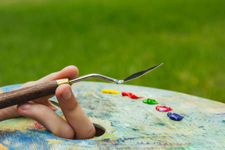 the hand of a European artist holds a mastekhin smeared in oil paint and a palette against the background of a green lawn. Blurred background. copy space. Mixing board.