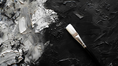 Creative banner with white rough stroke and brush, copy space, black textured background, minimalism. Generative AI.
