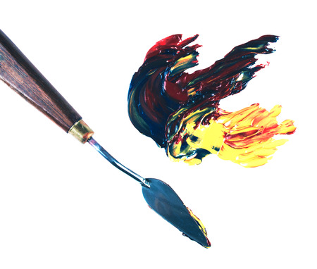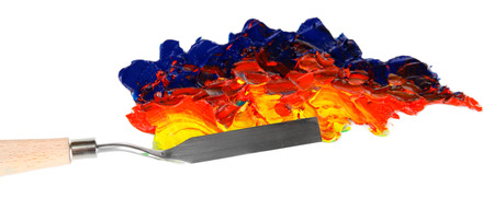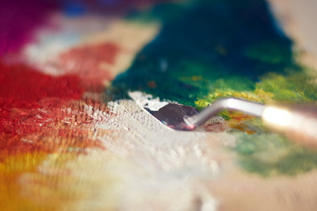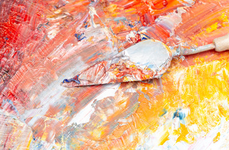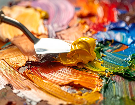 Close-up image of a palette knife smeared with vibrant oil paints, showcasing a rich array of colors ideal for artists seeking inspiration and creativity.