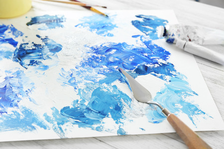 Professional acrylics paints with artistic putty knife and brush on canvas