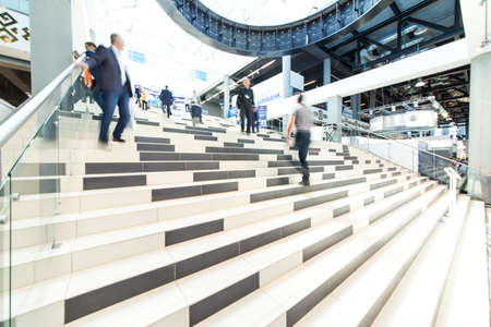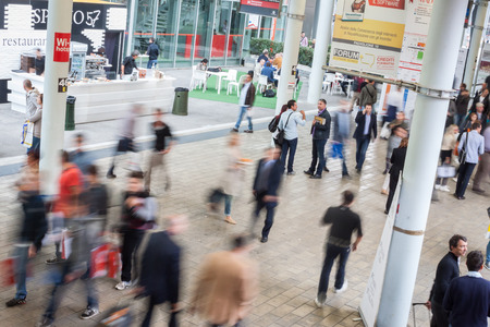 MILAN, ITALY - OCTOBER 3 Blur effect of people walking and visiting Made expo, international architecture and building trade show on October 3, 2013 in Milan